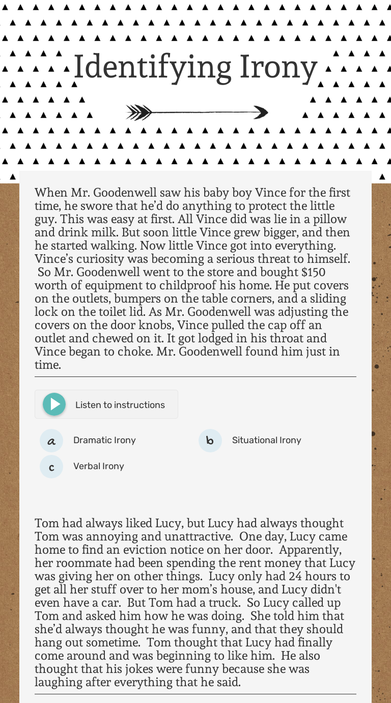 When watching a talk show, the audience. Irony sheets here's a graphic preview for all kindergarten, 1st grade, 2nd, class, 3rd grade, 4th grade and 5th grade irony worksheets. Worksheets are identifying irony, isnt it ironic, identifying iro. Free irony worksheets and activities for teachers and students. Check out this lesson from a classroom teacher who uses common sense education.